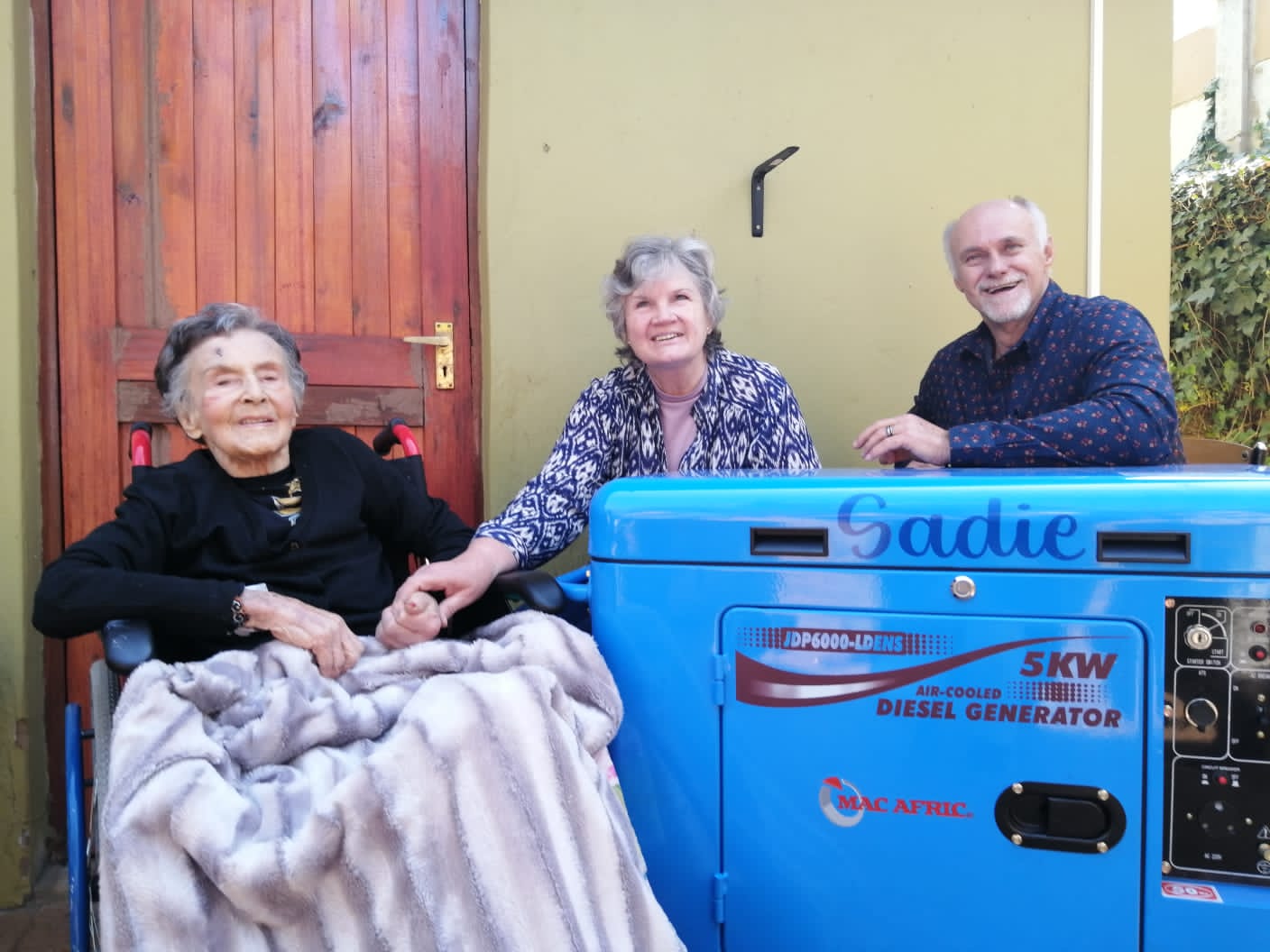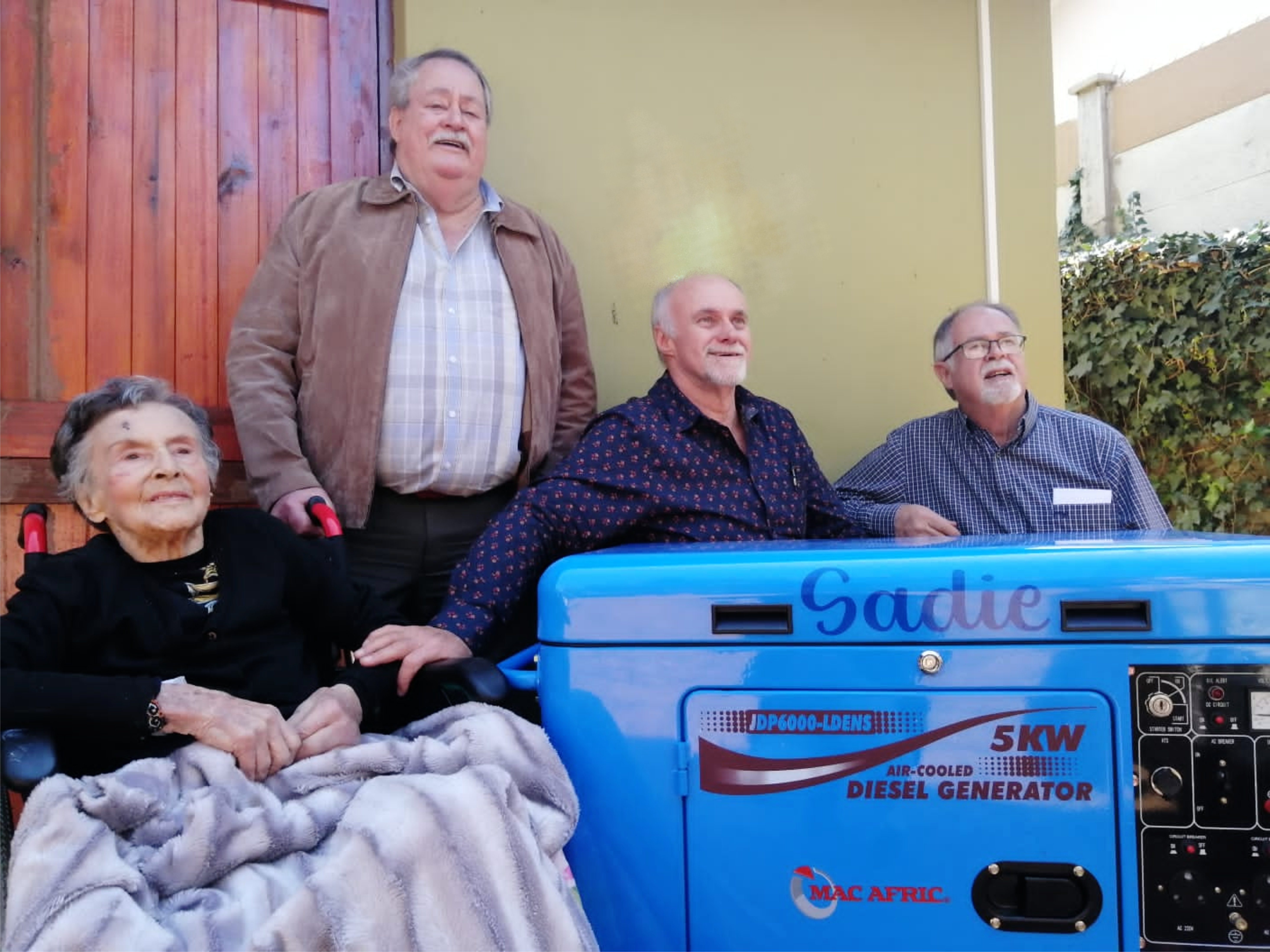 Ouma Sadie, Chris, Deon, Willie du Plessis: Reinetta Ridley bedank Deon du Plessis van harte vir die kragopwekker wat hy aan La Reynette Centre geskenk het namens sy ma Sadie. Dit ter ere aan haar voorbeeldige lewe van liefdadigheid. Baie dankie dat julle seker gemaak het dat elke pasient en personeellid ook ‘n geskenkie ontvang het. Dit was sommer emmers vol bederf. La Reynette Centre is ‘n verswakte sorg sentrum en krag onderbrekings vir ons bejaardes op suurstof masjiene is altyd ‘n krisis. Kragopwekker Sadie, wat aanhou werk wanneer Eskom ophou.