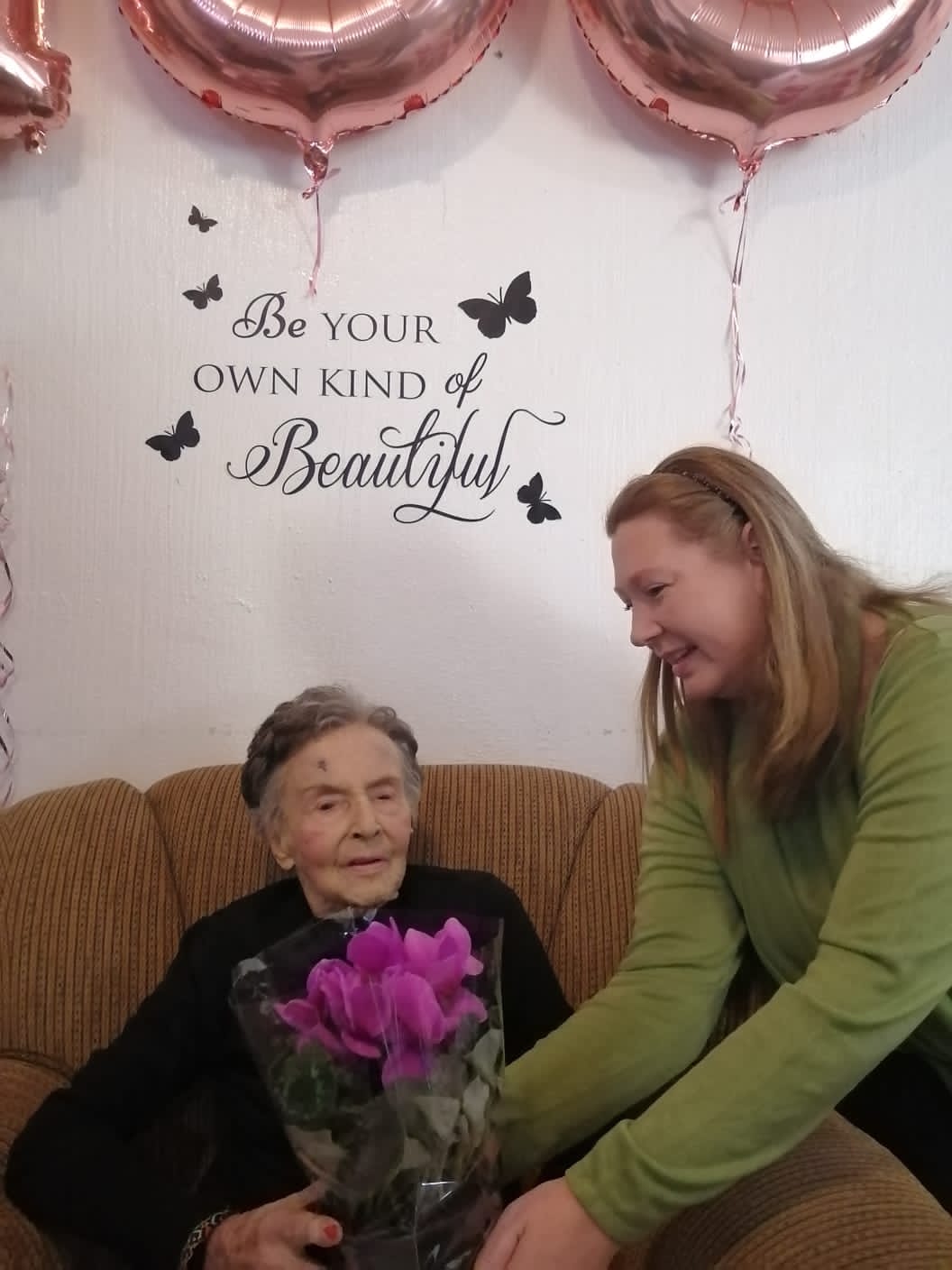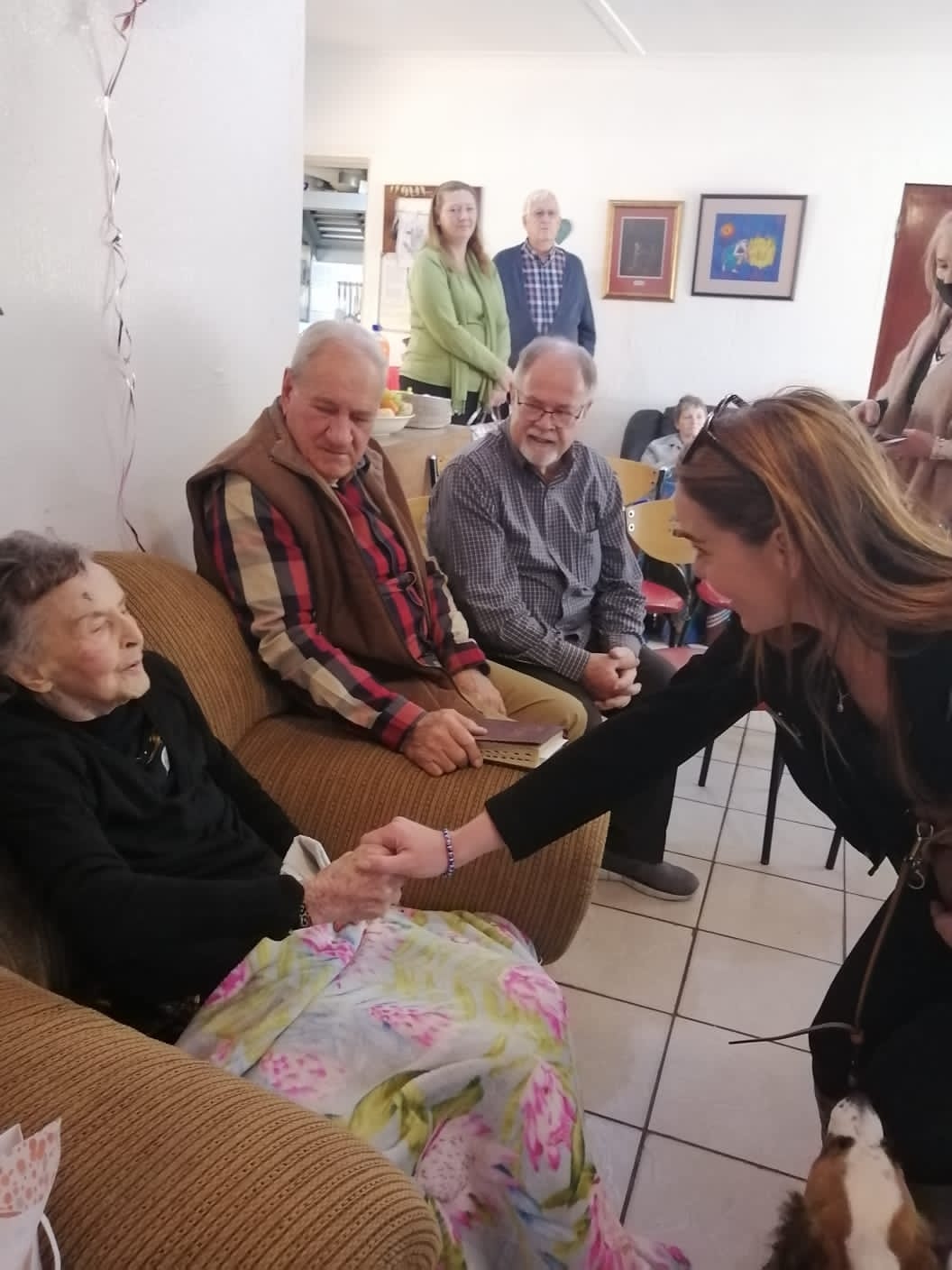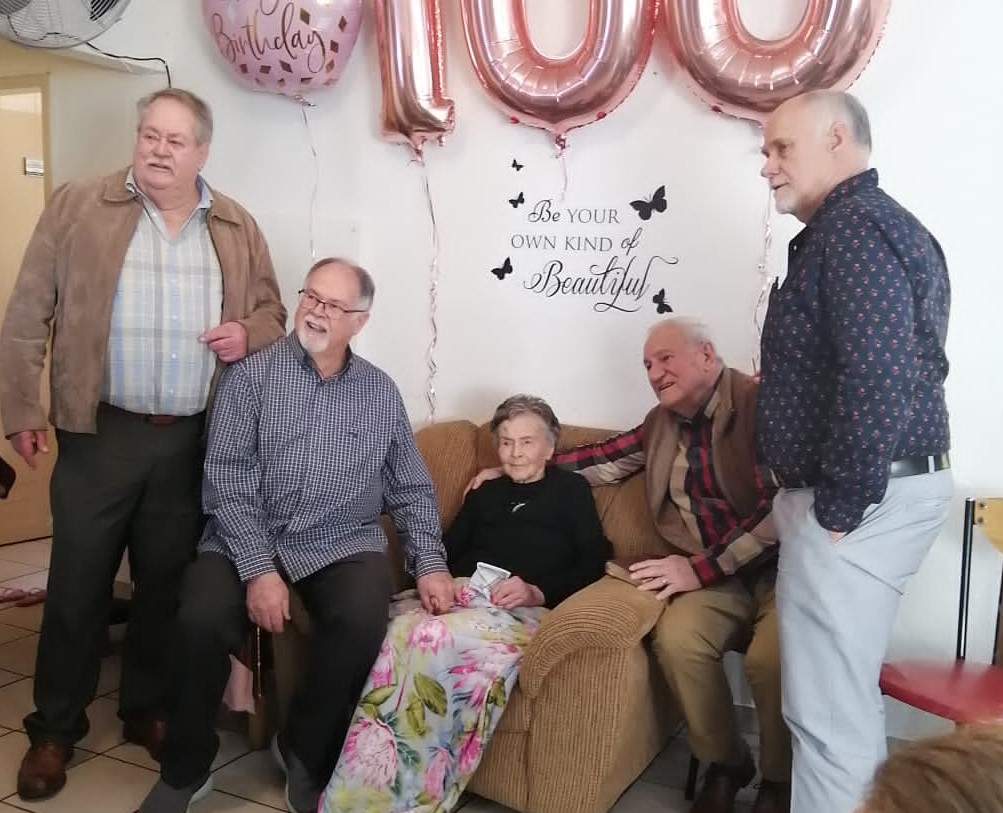 La Reynette Centre is baie ingenome met die raad se belangstelling in Krugersdorp se bejaardes. Dit het Aletta van Loggerenberg (wyk raadslid) en Zille McQuire (Plaaslike ekonomiese en landelike ontwikkeling raadslid) aan ons bewys deur Sadie se 100ste verjaardsdag te kom bywoon het. Baie dankie vir julle teenwoordigheid. Saam met hulle is Chris, Sadie se oudste seun.